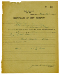 Summary Content type Content type Image Collection(s) Collection(s) City Analyst, Dominion Analyst - correspondence and reports Resource Type Resource Type Text Origin Information Origin Information Date Created/Date Issued 1915-12-30 Persons and Affiliations Persons Creator (cre): Vance, John Abstract/Description Description / Synopsis Description / Synopsis Item is a certificate of City Analyst (No. 310) completed by Vance related to analysis of milk powder. Language Language English Physical Description Extent Extent 1 report Identifiers Handle Handle Handle placeholder Access and Rights Use and Reproduction Use and Reproduction Images provided for research and reference use only. Permission to publish, copy, or otherwise use these images must be obtained from the Vancouver Police Museum and Archives. Rights Statement Rights Statement IN COPYRIGHT - EDUCATIONAL USE PERMITTED Subjects and Classifications Subject Topic Subject Topic Crime Analyst Food Inspection Subject Name Person Subject Name Person Vance, John Geographic Subject Geographic Subject Vancouver (B.C.)