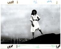 Image from a fashion shoot featuring a belted, A-line midi dress with a square neck and half-length kimono-style sleeves. Photographed on location atop a grassy hill against a marina and body of water in the Greater Vancouver Regional District. On the reverse are handwritten notes that may include the model’s name, date of photograph, printing instructions, and miscellaneous information.