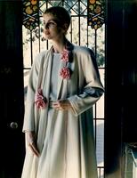 Image from a fashion shoot featuring a dress and coat ensemble in beige. Round neckline on the dress and raglan sleeves on the coat. Photographed against a door with stained glass windows in the Greater Vancouver Regional District. On the reverse are handwritten notes that may include the model’s name, date of photograph, printing instructions, and miscellaneous information.
