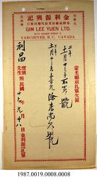 Box 1) 1) Invoice from Percey's Fur House, Oshkosh, Wis., dated April 30, 1912 2) Paper fragments with Chinese characters 3) Newspaper article with cloth backing 4) Map of central B.C. (1940) 5) Dept. of Lands & Forests (Forest Service) Log Book (1957) 6) Map of Barkerville (Dec. 1958) 7) Park Act (1977) 8) Attendance procedures (1978) 9) Attendance Procedures Manual (1977) 10) Monthly Time Book (Apr. 1966 - Apr. 1967) 11) B.C. Forest Service Diary (1964/08/01 - 1964/10/31) 12) ibid. (1965/08/16 - 1965/12/31) 13) ibid. (1966/07/27 - 1966/10/31) 14) ibid. (1967/02/10 - 1967/05/28) 15) ibid. (1967/05/01 - 1967/07/31) 16) Notebook from Wells Catholic Church 17) "The Little Knight of the X Bar B" 18) Photograph 19) Copy of Bill of Sale 20) Blanchette Armstrong material Box 2) 1) Tobacco tin 2) Picture mounting frame 3) Large photograph "Niagara Falls - From the Canadian Side" 4) Large photograph "A Harvest Scene in Canada" 5) Large photograph "Canadian Parliament Buildings --- Ottawa" 6) Prince George Elks Club Ensignia |PERCEY'S FUR HOUSE | SCHILLING, W. | INVOICE | COLONIST, THE | WILLIAMS CREEK | GOLD DISCOVERIES | MAPS | BRITISH COLUMBIA DEPT. OF LANDS & FORESTS | FOREST SERVICE | BARKERVILLE DEVELOPMENT | PARK ACT | LEGISLATION | BOPP, V. K. | PROCEDURES | JOYCE, EDNA | PRESCOTT, B. H. | EMPLOYEE RECORDS | DIARIES | WELLS | WELLS CATHOLIC CHURCH | BOOKS | SISTER DOROTHEA | DODD, W. W. | GENERAL MERCH |