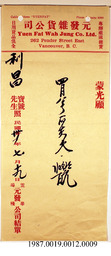 Box 1) 1) Invoice from Percey's Fur House, Oshkosh, Wis., dated April 30, 1912 2) Paper fragments with Chinese characters 3) Newspaper article with cloth backing 4) Map of central B.C. (1940) 5) Dept. of Lands & Forests (Forest Service) Log Book (1957) 6) Map of Barkerville (Dec. 1958) 7) Park Act (1977) 8) Attendance procedures (1978) 9) Attendance Procedures Manual (1977) 10) Monthly Time Book (Apr. 1966 - Apr. 1967) 11) B.C. Forest Service Diary (1964/08/01 - 1964/10/31) 12) ibid. (1965/08/16 - 1965/12/31) 13) ibid. (1966/07/27 - 1966/10/31) 14) ibid. (1967/02/10 - 1967/05/28) 15) ibid. (1967/05/01 - 1967/07/31) 16) Notebook from Wells Catholic Church 17) "The Little Knight of the X Bar B" 18) Photograph 19) Copy of Bill of Sale 20) Blanchette Armstrong material Box 2) 1) Tobacco tin 2) Picture mounting frame 3) Large photograph "Niagara Falls - From the Canadian Side" 4) Large photograph "A Harvest Scene in Canada" 5) Large photograph "Canadian Parliament Buildings --- Ottawa" 6) Prince George Elks Club Ensignia |PERCEY'S FUR HOUSE | SCHILLING, W. | INVOICE | COLONIST, THE | WILLIAMS CREEK | GOLD DISCOVERIES | MAPS | BRITISH COLUMBIA DEPT. OF LANDS & FORESTS | FOREST SERVICE | BARKERVILLE DEVELOPMENT | PARK ACT | LEGISLATION | BOPP, V. K. | PROCEDURES | JOYCE, EDNA | PRESCOTT, B. H. | EMPLOYEE RECORDS | DIARIES | WELLS | WELLS CATHOLIC CHURCH | BOOKS | SISTER DOROTHEA | DODD, W. W. | GENERAL MERCH |