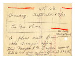 Summary Content type Content type Image Collection(s) Collection(s) Investigation notes - general, vol. 2 Resource Type Resource Type Text Origin Information Origin Information Date Created/Date Issued 1933-09-19 Persons and Affiliations Persons Creator (cre): Vance, John Abstract/Description Description / Synopsis Description / Synopsis Item is a phone message for Vance that the Mayor called. Language Language English Physical Description Extent Extent 1 note Identifiers Handle Handle Handle placeholder Access and Rights Use and Reproduction Use and Reproduction Images provided for research and reference use only. Permission to publish, copy, or otherwise use these images must be obtained from the Vancouver Police Museum and Archives. Rights Statement Rights Statement IN COPYRIGHT - EDUCATIONAL USE PERMITTED Subjects and Classifications Subject Topic Subject Topic Crime Analyst Subject Name Person Subject Name Person Vance, John Geographic Subject Geographic Subject Vancouver (B.C.)