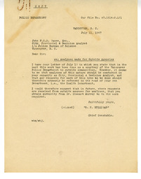 Summary Content type Content type Image Collection(s) Collection(s) Investigation notes - general, vol. 4 Resource Type Resource Type Text Origin Information Origin Information Date Created/Date Issued 1947-07-11 Persons and Affiliations Persons Creator (cre): Vance, John Abstract/Description Description / Synopsis Description / Synopsis Item is a letter to Vance regarding how to request permission to assist on cases outside of the VPD. Language Language English Physical Description Extent Extent 1 letter (correspondence) Identifiers Handle Handle Handle placeholder Access and Rights Use and Reproduction Use and Reproduction Images provided for research and reference use only. Permission to publish, copy, or otherwise use these images must be obtained from the Vancouver Police Museum and Archives. Rights Statement Rights Statement IN COPYRIGHT - EDUCATIONAL USE PERMITTED Subjects and Classifications Subject Topic Subject Topic Crime Analyst Subject Name Person Subject Name Person Vance, John Geographic Subject Geographic Subject Vancouver (B.C.)