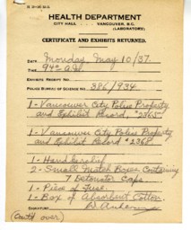 Summary Content type Content type Digital Document Collection(s) Collection(s) Investigation notes - general, vol. 6 Resource Type Resource Type Text Origin Information Origin Information Date Created/Date Issued 1937-05-10 Persons and Affiliations Persons Creator (cre): Vance, John Abstract/Description Description / Synopsis Description / Synopsis Item is a certificate of evidence and items collected for analysis belonging to J. Sandusky. Language Language English Physical Description Extent Extent 1 certificate Identifiers Handle Handle Handle placeholder Access and Rights Use and Reproduction Use and Reproduction Images provided for research and reference use only. Permission to publish, copy, or otherwise use these images must be obtained from the Vancouver Police Museum and Archives. Rights Statement Rights Statement IN COPYRIGHT - EDUCATIONAL USE PERMITTED Subjects and Classifications Subject Topic Subject Topic Crime Analyst Subject Name Person Subject Name Person Vance, John Geographic Subject Geographic Subject Vancouver (B.C.)