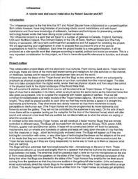 Summary Content type Content type Digital Document Collection(s) Collection(s) KIT and Robert Saucier, 'Infrasense' Resource Type Resource Type Text Genre Genre proposals Origin Information Origin Information Place Vancouver, BC Date Created/Date Issued 2004 Publisher grunt gallery Persons and Affiliations Persons Author (aut): KIT Author (aut): Saucier, Robert Abstract/Description Description / Synopsis Description / Synopsis Proposal of Infrasense, including introduction, outline, technical specs, website information, funders, and research. Collected material for Infrasense by Robert Saucier and KIT artist collective. Physical Description Extent Extent 5 pages Identifiers Local Identifier Local Identifier 2005.1112 INF Handle Handle Handle placeholder Access and Rights Use and Reproduction Use and Reproduction In Copyright. For more information, researcher inquiries, or takedown requests please contact grunt's archives manager dan@grunt.ca Rights Statement Rights Statement IN COPYRIGHT Subjects and Classifications Subject Topic Subject Topic Technology Viruses Trojan Horses Computer Bugs Robotics Subject Name Person Subject Name Person , KIT Saucier, Robert
