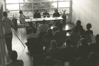 Stiles, Robert, Arcand, and Alteen and the audience discuss the nature and veracity of performance art documentation, the impulse to document and publish as a function of arts institutions, and the interplay of theory born of intuition and understanding via academic research, among related topics.