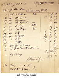 Summary Content type Content type Image Collection(s) Collection(s) Hong and Lee Chong Collection Genre Genre invoices Origin Information Origin Information Date Created/Date Issued 1941-08-26 Persons and Affiliations Persons Creator (cre): Hong, Wong Mon Abstract/Description Description / Synopsis Description / Synopsis Box 40) Freight books from 1933 - 1937, a hotel register from 1928 - 1935, and a Lee Chong account book from 1929 - 1931. Publication/Container Information Publication Title Publication Title Hong And Lee Chong Collection Physical Description Extent Extent 60 Boxes, 9 Books (8 Linear metres), 9 Boxes Relationships Related Item Related Item Relationship Type host Title Hong And Lee Chong Collection Identifiers Local Identifier Local Identifier RG136 Handle Handle Handle placeholder Access and Rights Use and Reproduction Use and Reproduction Restricted Access Rights Statement Rights Statement COPYRIGHT NOT EVALUATED