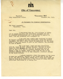 Summary Content type Content type Digital Document Collection(s) Collection(s) Investigations and correspondence Resource Type Resource Type Text Origin Information Origin Information Date Created/Date Issued 1923-11-05 Persons and Affiliations Persons Creator (cre): Vance, John Abstract/Description Description / Synopsis Description / Synopsis Item is a letter to Chief Constable asking for more equipment to support Vance's work. Language Language English Physical Description Extent Extent 1 letter (correspondence) Identifiers Handle Handle Handle placeholder Access and Rights Use and Reproduction Use and Reproduction Images provided for research and reference use only. Permission to publish, copy, or otherwise use these images must be obtained from the Vancouver Police Museum and Archives. Rights Statement Rights Statement IN COPYRIGHT - EDUCATIONAL USE PERMITTED Subjects and Classifications Subject Topic Subject Topic Crime Analyst Subject Name Person Subject Name Person Vance, John Geographic Subject Geographic Subject Vancouver (B.C.)