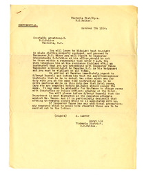 Item is a typed confidential letter to Constable Armstrong of BC Police, from R. Harvey, Sergeant of Victoria Police. Letter is regarding bodyguard duties to protect Vance while in Nanaimo.
