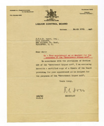 Summary Content type Content type Image Collection(s) Collection(s) Correspondence [professional and private], accolades and associations, vol. 3 Resource Type Resource Type Text Origin Information Origin Information Date Created/Date Issued 1925-03-10 Persons and Affiliations Persons Creator (cre): Vance, John Abstract/Description Description / Synopsis Description / Synopsis Item is a letter from the Secretary of the Liquor Control Board. Language Language English Physical Description Extent Extent 1 letter (correspondence) Identifiers Handle Handle Handle placeholder Access and Rights Use and Reproduction Use and Reproduction Images provided for research and reference use only. Permission to publish, copy, or otherwise use these images must be obtained from the Vancouver Police Museum and Archives. Rights Statement Rights Statement IN COPYRIGHT - EDUCATIONAL USE PERMITTED Subjects and Classifications Subject Name Person Subject Name Person Vance, John