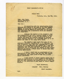 Summary Content type Content type Image Collection(s) Collection(s) Correspondence [professional and private], accolades and associations, vol. 2 Resource Type Resource Type Text Origin Information Origin Information Date Created/Date Issued 1933-05-08 Persons and Affiliations Persons Creator (cre): Vance, John Abstract/Description Description / Synopsis Description / Synopsis Item is a typed letter to Vance from the Chief Constable, Thomas Heatley. Language Language English Physical Description Extent Extent 1 letter (correspondence) Identifiers Handle Handle Handle placeholder Access and Rights Use and Reproduction Use and Reproduction Images provided for research and reference use only. Permission to publish, copy, or otherwise use these images must be obtained from the Vancouver Police Museum and Archives. http://rightsstatements.org/page/InC-EDU/1.0/ Subjects and Classifications Subject Topic Subject Topic Police Criminology Subject Name Person Subject Name Person Vance, John Geographic Subject Geographic Subject Victoria (B.C.)