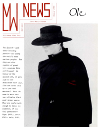 Client newsletter highlighting holiday wear. Included are an Andalusian cape with 'lips' via piping around a pocket's opening and a velvet suit shown with a cotton batiste blouse. Logo skirts are introduced, featuring either LMW or the client's initials upon request.