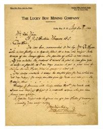 Summary Content type Content type Image Collection(s) Collection(s) Vance filing - Vance [associations and employment correspondence], vol. 2 Resource Type Resource Type Text Origin Information Origin Information Date Created/Date Issued 1904-08-24 Persons and Affiliations Persons Creator (cre): Vance, John Abstract/Description Description / Synopsis Description / Synopsis Item is a handwritten referral letter for Vance from Lucky Boy Mining Company. Language Language English Physical Description Extent Extent 1 letter (correspondence), copy Identifiers Handle Handle Handle placeholder Access and Rights Use and Reproduction Use and Reproduction Images provided for research and reference use only. Permission to publish, copy, or otherwise use these images must be obtained from the Vancouver Police Museum and Archives. Rights Statement Rights Statement IN COPYRIGHT - EDUCATIONAL USE PERMITTED Subjects and Classifications Subject Name Person Subject Name Person Vance, John Geographic Subject Geographic Subject Vancouver (B.C.)