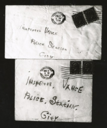 Summary Content type Content type Image Collection(s) Collection(s) Vance bomb threat photographs and notes Resource Type Resource Type Text Origin Information Origin Information Date Created/Date Issued 1934-02-12 to 1934-03-04 Persons and Affiliations Persons Creator (cre): Vance, John Abstract/Description Description / Synopsis Description / Synopsis Item is a photograph of envelopes postmarked Feb 12, 1934 and March 4, 1934 that contained threat letters sent to Vance. Language Language English Physical Description Extent Extent 1 photograph Identifiers Handle Handle Handle placeholder Access and Rights Use and Reproduction Use and Reproduction Images provided for research and reference use only. Permission to publish, copy, or otherwise use these images must be obtained from the Vancouver Police Museum and Archives. Rights Statement Rights Statement IN COPYRIGHT - EDUCATIONAL USE PERMITTED Subjects and Classifications Subject Topic Subject Topic Crime Analyst Bomb Subject Name Person Subject Name Person Vance, John Geographic Subject Geographic Subject Vancouver (B.C.)