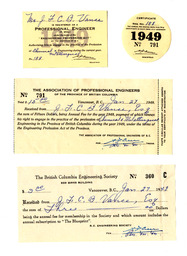 Item is a fifteen-dollar receipt and another three-dollar receipt from The Association of Professional Engineers to Vance. Item is clipped together with a membership card and registration certificate stating that the annual membership fee has been paid and when it is valid until.