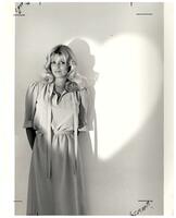 Image from a fashion shoot featuring a dress with a tie collar and elbow-length cuffed sleeves. Photographed in an unknown studio. On the reverse are handwritten notes that may include the model’s name, date of photograph, printing instructions, and miscellaneous information.