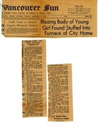 Summary Content type Content type Image Collection(s) Collection(s) Investigations and correspondence Resource Type Resource Type Text Origin Information Origin Information Date Created/Date Issued 1938-12-27 Persons and Affiliations Persons Creator (cre): Vance, John Abstract/Description Description / Synopsis Description / Synopsis Newspaper clipping "Blazing Body of Young Girl Found Stuffed into Furnace of City Home" Language Language English Physical Description Extent Extent 1 newspaper clipping Identifiers Handle Handle Handle placeholder Access and Rights Use and Reproduction Use and Reproduction Images provided for research and reference use only. Permission to publish, copy, or otherwise use these images must be obtained from the Vancouver Police Museum and Archives. Rights Statement Rights Statement IN COPYRIGHT - EDUCATIONAL USE PERMITTED Subjects and Classifications Subject Topic Subject Topic Crime Analyst Subject Name Person Subject Name Person Vance, John Geographic Subject Geographic Subject Vancouver (B.C.)