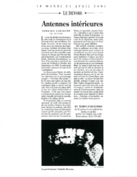 Summary Content type Content type Digital Document Collection(s) Collection(s) Nathalie Derome Girouette-Weathercock Resource Type Resource Type Text Genre Genre articles Origin Information Origin Information Date Created/Date Issued 2001-04-24 Publisher Le Devoir Persons and Affiliations Persons Author (aut): Lemarche, Bernard Photographer (pht): Senécal, Luc Abstract/Description Description / Synopsis Description / Synopsis Photocopied French language article on Nathalie Derome's work Du temps d'antennes. Collected material for Girouette-Weathercock. Physical Description Extent Extent 1 page Identifiers Local Identifier Local Identifier 2001.1129 GIR Handle Handle Handle placeholder Access and Rights Use and Reproduction Use and Reproduction In Copyright. For more information, researcher inquiries, or takedown requests please contact grunt's archives manager dan@grunt.ca Rights Statement Rights Statement IN COPYRIGHT Subjects and Classifications Subject Topic Subject Topic Theatre Performance Art Du temps d'antennes (Nathalie Derome work) Subject Name Person Subject Name Person Derome, Nathalie Geographic Subject Geographic Subject 813 Ontario E, Montréal, PQ