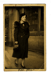 Black & white photo of woman walking down the street. Handwritten annotation on back of postcard says "109993. Mrs. Alice Arnold, also known as Mrs. Eva Johnson and as Billie Johnson. Killed by a streetcar at 37th Ave and Oak Street at 1:45am on Sunday."