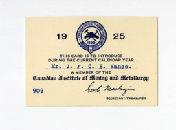Summary Content type Content type Image Collection(s) Collection(s) Vance filing - Vance [associations and employment correspondence], vol. 1 Resource Type Resource Type Text Origin Information Origin Information Date Created/Date Issued 1925-01-01 Persons and Affiliations Persons Creator (cre): Vance, John Abstract/Description Description / Synopsis Description / Synopsis Item is Vance's membership card for 1925. Language Language English Physical Description Extent Extent 1 certificate (document) Identifiers Handle Handle Handle placeholder Access and Rights Use and Reproduction Use and Reproduction Images provided for research and reference use only. Permission to publish, copy, or otherwise use these images must be obtained from the Vancouver Police Museum and Archives. Rights Statement Rights Statement IN COPYRIGHT - EDUCATIONAL USE PERMITTED Subjects and Classifications Subject Topic Subject Topic Membership Associations Mining Subject Name Person Subject Name Person Vance, John Geographic Subject Geographic Subject Vancouver (B.C.)