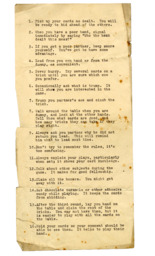 Summary Content type Content type Image Collection(s) Collection(s) Vance filing - Vance [associations and employment correspondence], vol. 5 Resource Type Resource Type Text Origin Information Origin Information Date Created/Date Issued Unknown year in the century of the 1900s Persons and Affiliations Persons Creator (cre): Vance, John Abstract/Description Description / Synopsis Description / Synopsis Item is a typed list of 16 rules to follow when playing cards. Language Language English Physical Description Extent Extent 1 typed list Identifiers Handle Handle Handle placeholder Access and Rights Use and Reproduction Use and Reproduction Images provided for research and reference use only. Permission to publish, copy, or otherwise use these images must be obtained from the Vancouver Police Museum and Archives. Rights Statement Rights Statement IN COPYRIGHT - EDUCATIONAL USE PERMITTED Subjects and Classifications Subject Topic Subject Topic Playing cards Subject Name Person Subject Name Person Vance, John Geographic Subject Geographic Subject Vancouver (B.C.)