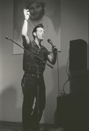 T. Paul Ste. Marie on stage, with eyes closed, holding the mic with one hand and throwing the other up. Still from Impure: Reinventing the Word: The Theory, Practice, and Oral History of 'Spoken Word' in Montreal with writers Vincent Tinguely and Victoria Stanton.